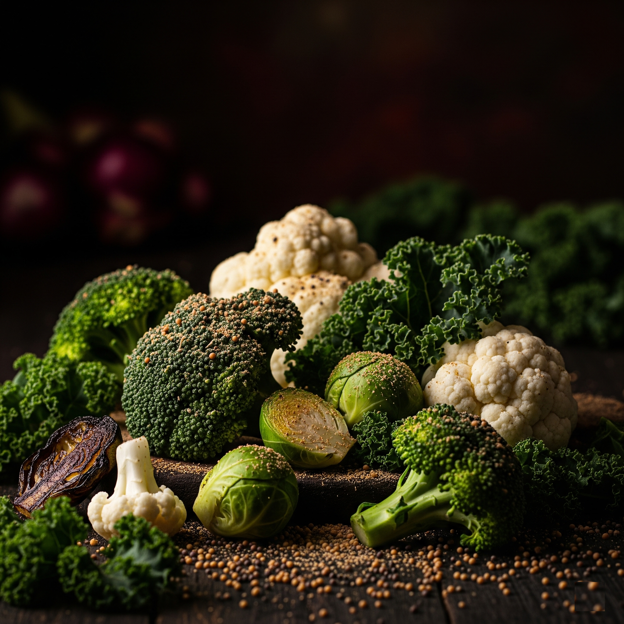 Cruciferous veggies broccoli, red cabbage, cauliflower, and brussel sprouts with mustard seed powder